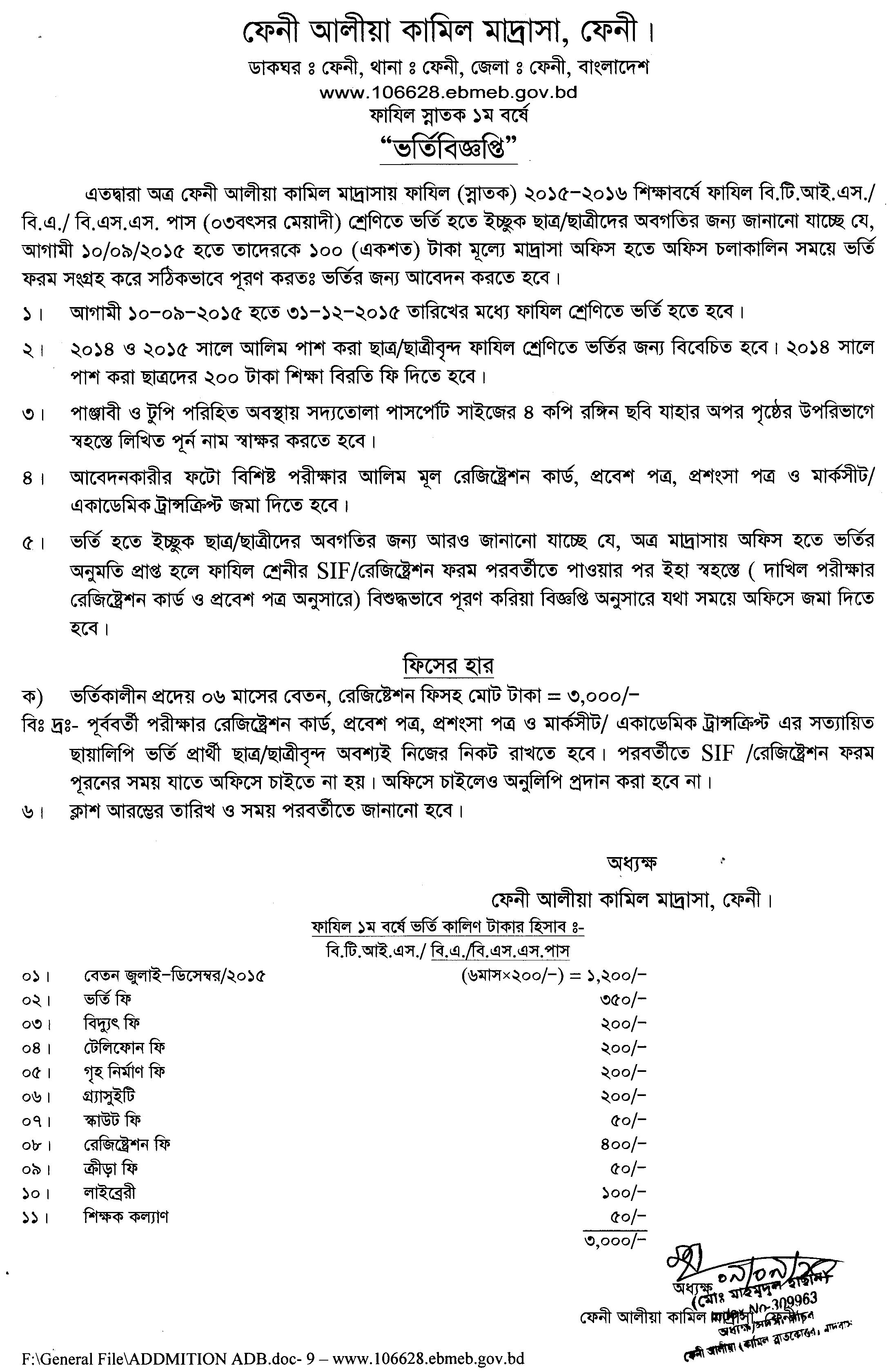Admission Notice Feni Kamil Madrasah